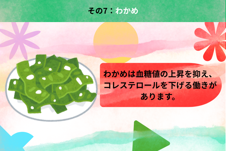 わかめに含まれるアルギン酸は、血糖値の上昇を抑え、コレステロールを下げる働きがあります。