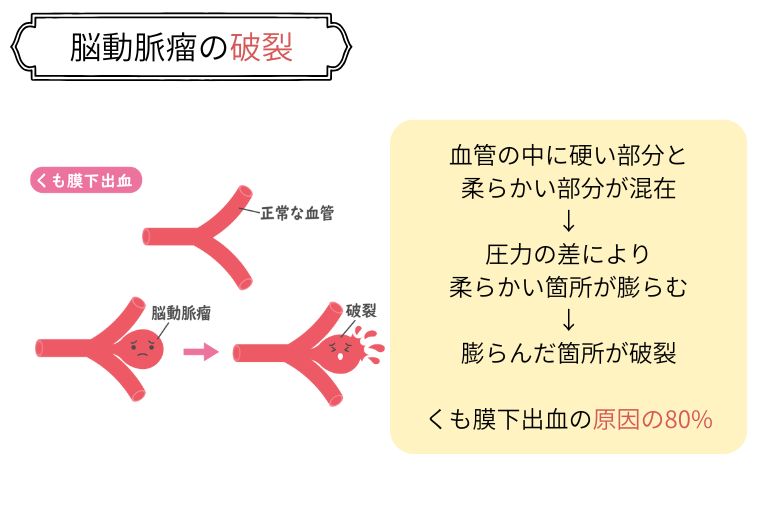 脳にできた動脈瘤は「脳動脈瘤」と呼ばれ、これが破裂することでくも膜下出血が発症します。くも膜下出血の原因の約80%は脳動脈瘤の破裂とされており、その多くは後天的に形成されます。一方で、生まれつき血管の構造に弱さを持つ先天的な動脈瘤も存在します。また、交通事故などの外傷や、脳動静脈奇形が原因となる場合もあります。