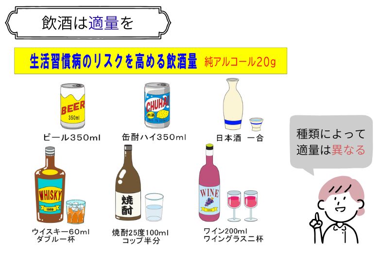 お酒の種類によって含まれる純アルコール量は異なり、ビール500mlで純アルコール20g、日本酒1合で22g、焼酎1合で36gほどです。