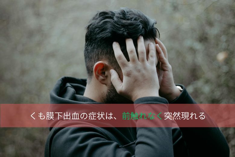 くも膜下出血の症状は、前触れなく突然現れることが特徴です。代表的な症状としては、激しい頭痛、意識がもうろうとする、意識消失、嘔吐、けいれん、視覚障害、感覚異常、手足の運動麻痺などが挙げられます。特に「人生で最も激しい頭痛」と表現されるほどの痛みは、非常に重要な危険信号です。