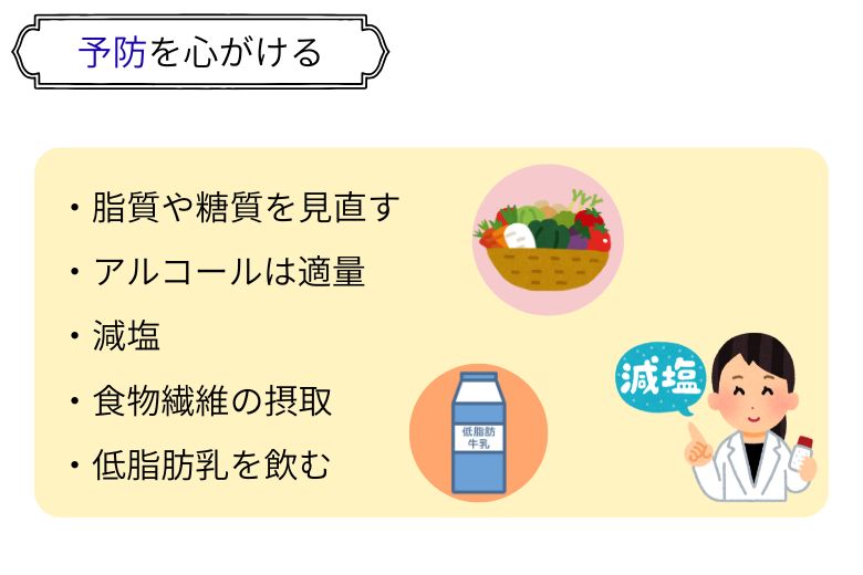 くも膜下出血の予防には、脂質や糖質、アルコールの摂取量を見直し、減塩を意識した食生活を心がけることが重要です。食物繊維を多く含む野菜、海藻、果物を積極的に摂ることで、動脈硬化の予防につながります。また、低脂肪乳を飲む習慣がある人は、発症リスクが低い傾向にあるとも報告されています。