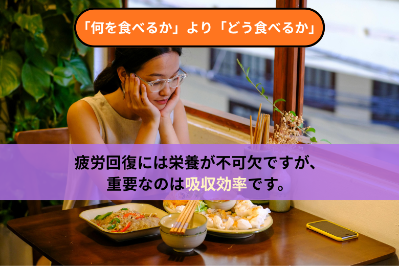 疲労回復には栄養が不可欠ですが、重要なのは吸収効率です。腸内環境が整っていなければ、どれほど栄養価の高い食事でも十分に活用されません。