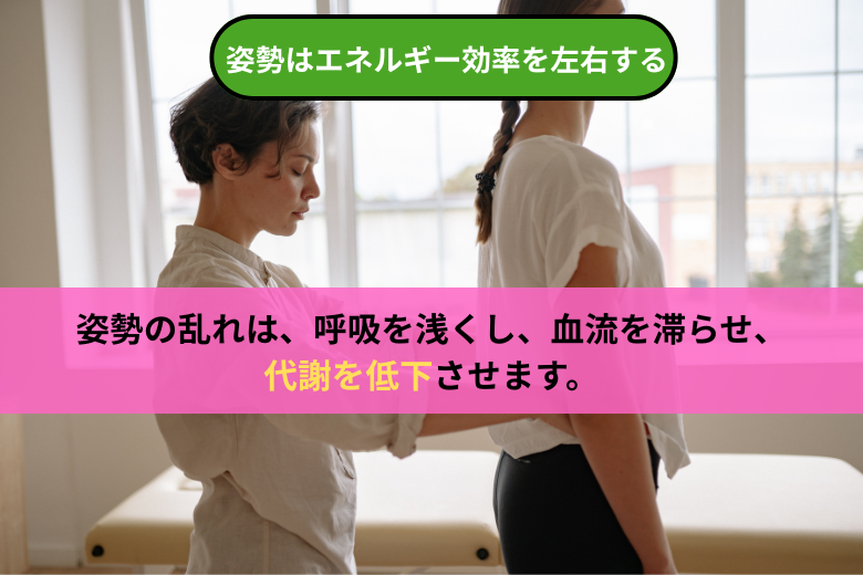 長時間のデスクワークやスマートフォン操作によって、猫背や巻き肩の姿勢が常態化している人は少なくありません。しかし姿勢の乱れは、呼吸を浅くし、血流を滞らせ、代謝を低下させます。