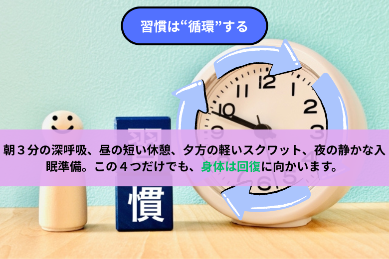 すべてを完璧に行う必要はありません。朝3分の深呼吸、昼の短い休憩、夕方の軽いスクワット、夜の静かな入眠準備。この4つだけでも、身体は一日の中で何度も回復モードへと切り替わります。