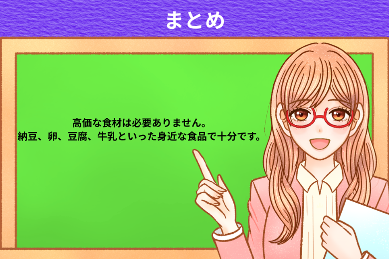 高価な食材は必要ありません。納豆、卵、豆腐、牛乳といった身近な食品で十分です。