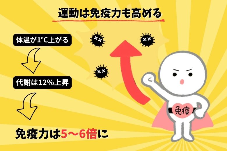 運動にはダイエットだけでなく、免疫力を高める効果もあります。身体を動かすと体温が上昇し、代謝が活発になります。体温が1℃上がると代謝は12%上昇し、免疫力は5~6倍に高まるとも言われています。
