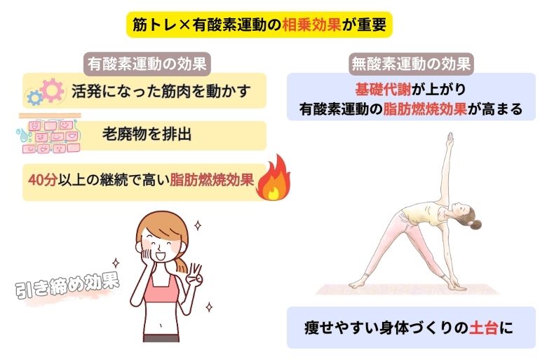どちらか一方だけでは十分な効果は期待できません。実は、筋トレと有酸素運動はお互いの効果を高め合う関係にあります。