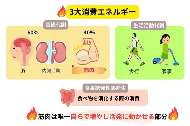 さらに基礎代謝の内訳を見ると、その6割は脳や消化器などの内臓活動が占め、残りの4割が筋肉による消費です。臓器の消費量は自分ではコントロールできませんが、筋肉は唯一、自らの努力で増やし、活発に動かすことのできる部分です。